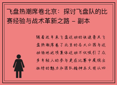 本文探讨了北京羽毛球队的训练与管理体系,旨在深入分析其成功背后的关键因素。首先,从培训理念入手,介绍了北京羽毛球队如何通过科学的训练方法和系统的课程设置,提高运动员的竞技水平。其次,文章分析了教练团队的构成与职责,以及他们在技术指导、心理辅导等方面的重要性。此外,队伍的管理体系也被详细阐述,包括选拔机制、赛事安排和日常管理。最后,我们讨论了心理素质培养对运动员表现的重要影响,以及如何通过多种方式提...